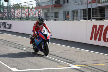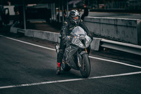 MOSCOW, RUSSIA - JULY 21, 2019: A motorcyclist drives up to the starting line after the warm-up lap for the start of the Russian championship of motorcycle racing RSBK 2019 in Moscow Raceway