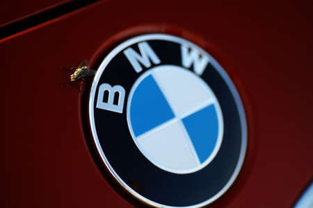 Bucharest, Romania - August 4, 2013: Color shot logo of a BMW car with a fly on it. BMW (Bayerische Motoren Werke) is a German automobile, motorcycle and engine manufacturing company headquartered in Munich, Bavaria, Germany.