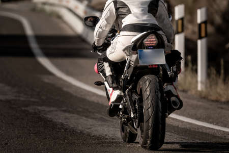 back view of a young biker woman dressed in a leather protection suit and safety helmet riding her motorcycle on an asphalt road