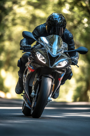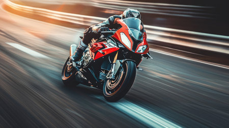 a motorcyclist speeding on a highway, leaning into a sharp corner with sporty precision, in a realistic photograph