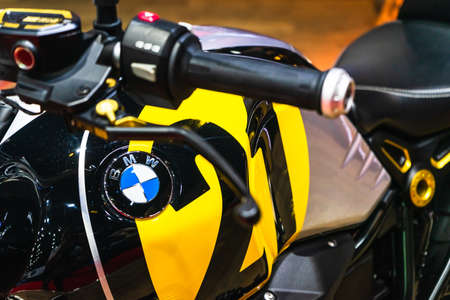 Bangkok, Thailand - March 31, 2019: Close up selective focus of the tank of BMW R nine T pure Option 21 Naked Roaster bike Modified.