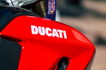 Seville Spain July 09, 2021 Ducati motorcycle parked in the streets of Seville, an emblematic city and the capital of the region of Andalusia, in the south of Spain