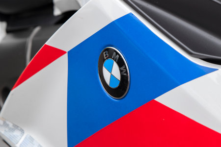 Bangkok, Thailand - March 31, 2019: Close up of a BMW logo on a BMW sport motorcycle tank at BANGKOK INTERNATIONAL MOTOR SHOW 2019.