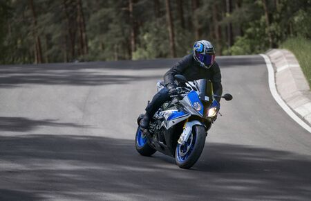 10-05-2020 Ropazi, Latvia Motorcyclist at sport bike rides by empty asphalt road. sport bike.