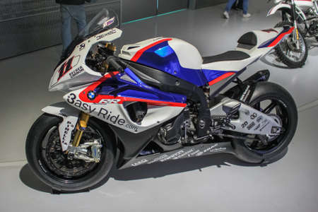 Germany, Munich - April 27, 2011: BMW S1000 RR sports motorcycle series production in the exhibition hall of the BMW Museum. Production of the model began in 2009.