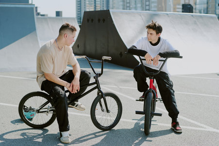 Two Caucasian teenagers sitting on BMX bikes talking at outdoor skatepark, both wearing casual clothing, urban background with ramps and buildings visible in distance