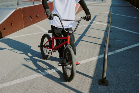 BRISBANE - OCT 10 2023:Person riding on BMX bike on the road.BMX biking requires physical fitness and coordination.