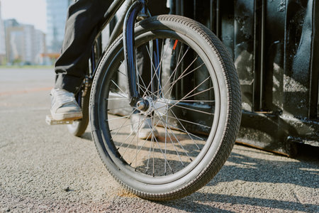 Unrecognizable teen boy standing next to BMX bicycle outdoors, only lower body and front wheel visible, wearing casual shoes, urban background with buildings and asphalt