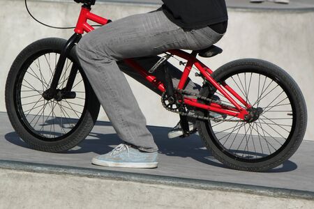 Bmx rider performing tricks at skatepark. Outdoors