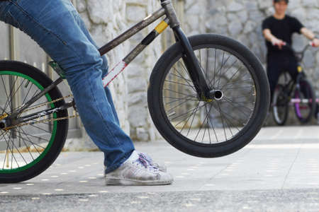 The guy on the BMX bike performs a trick on the front wheel.