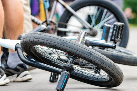 Bmx bicycles lays on the ground in the skatepark. Bicycle repair