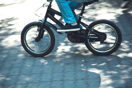 Young cyclist with bmx ready to start. Trendy young boy no face riding a bicycle looking the race track. Child having fun outdoor in the park. Competition, youth, brave, sport, outdoors concept