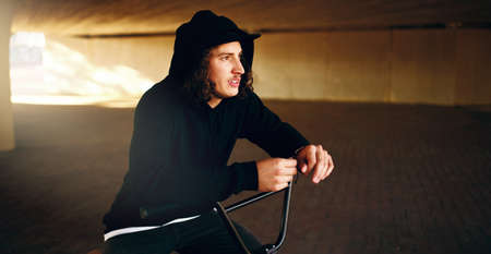 Mind full of tricks. Cropped shot of a young man chilling on his BMX in an underground parking lot.