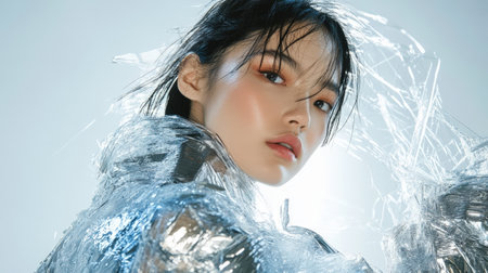 Woman with dark hair in a reflective, textured garment against a bright, slightly hazy background. Modern and abstract fashion portrait
