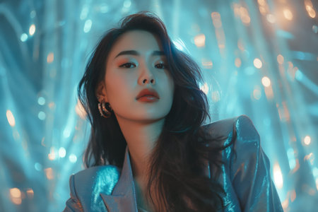 Young beautiful brunette Asian woman with evening makeup wears shiny suit at the party