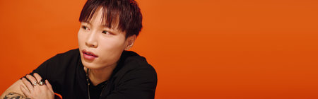 A stylish young Asian man shows off his fashion and tattoos against a bold orange backdrop.