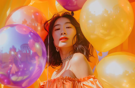 A girl in a cascade of vibrant balloons and confetti, set against a backdrop of rich, dark orange and gold hues.