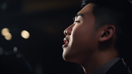 Opera Singer Male Asian Young Adult Rehearsing and performing in operas, showcasing vocal range and technique in Opera house. Generative AI AIG22.