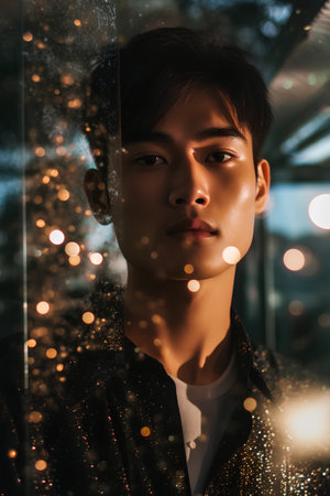 A striking young Asian man gazes intently, showcasing his attractive features and expressive eyes.