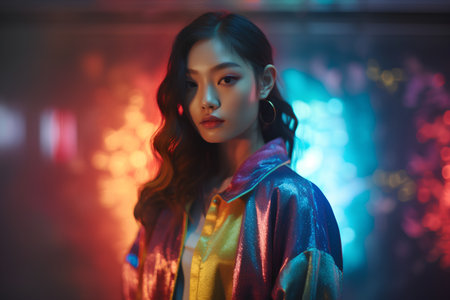 Vibrant portrait of young Asian female with neon lighting.