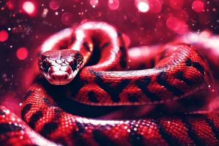 A red snake with black markings is curled up on the ground. The snake is surrounded by a blurry background, giving the image a dreamy, ethereal quality