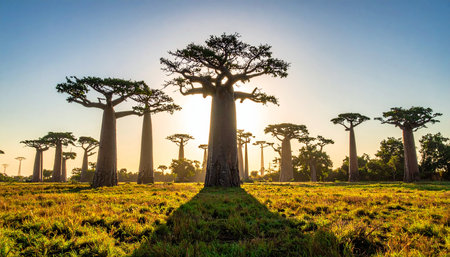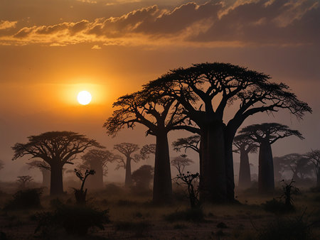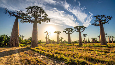 Dusk showing majestic baobab trees in madagascar during a golden hour sunset with sun flares keywords:...