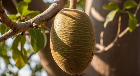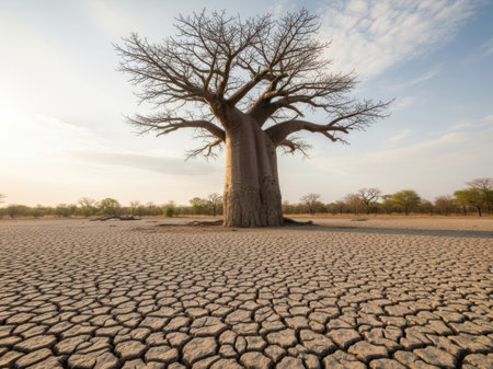 Ancient baobab tree surrounded by a golden savanna, water droplets shimmering on its thick bark after a gentle rain generative ai