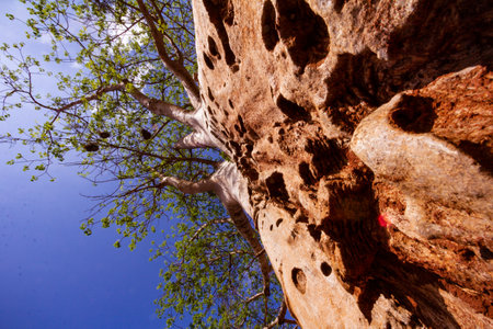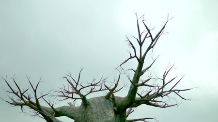 An ancient baobab tree with a massive trunk and sparse leaves creates a unique and striking background with copy space.