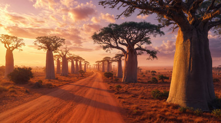 Avenue of the Baobabs in Madagascar, showcasing tall, majestic baobab trees lining a dirt road under a warm sunset, creating a serene and picturesque African landscape, perfect for nature and travel themes.