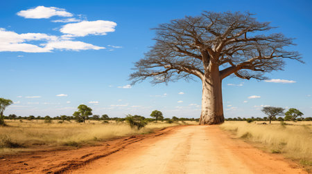 Baobab trees stand prominently under a clear blue sky, their expansive canopies casting intricate shadows on the sunlit, red dirt path. surrounding greenery contrasts with the vivid landscape, offering a serene, natural scene. Generative AI