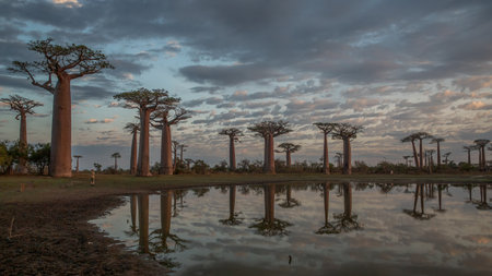 Dusk showing baobab alley in madagascar with a dirt road and dramatic clouds at sunset keywords: baobab...
