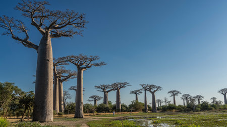 Rows of huge baobabs grow along the dirt road. Thick trunks, bizarre compact crowns of exotic trees against the blue sky. A tiny silhouette of a man on the shore of a pond
