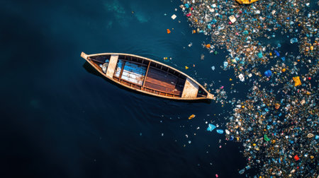 A boat sailing through polluted waters surrounded by plastic waste