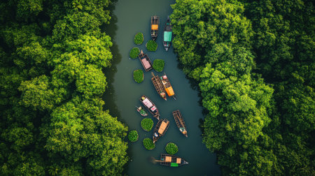 Colorful boats float gently along a winding river surrounded by thick greenery and flourishing water lilies on a bright day, showing nature's beauty.