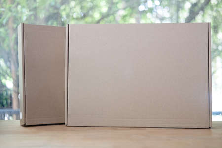 Open brown box with space on blurred background, empty paper box, simple packaging design