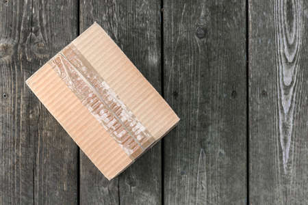 Cardboard delivery parcel box delivered to doorstep on old wood background, from above with copy space