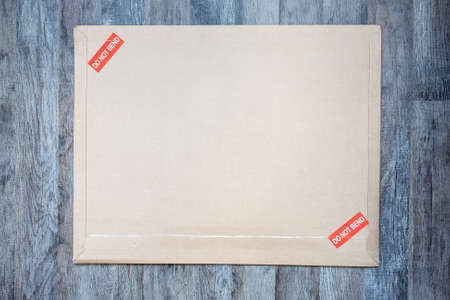 Old and dirty brown paper big size envelope on wooden background marked red DO NOT BEND, mail postage shipping business papers, documents and fragile items concept