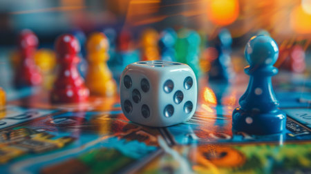 A focused view of a single dice resting on a board game surface, showing the intricate design and numbering of the dice.