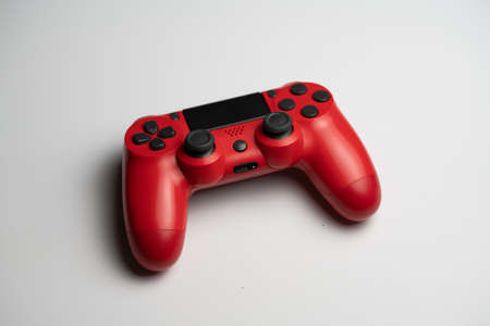 A video game controller with a red and white design