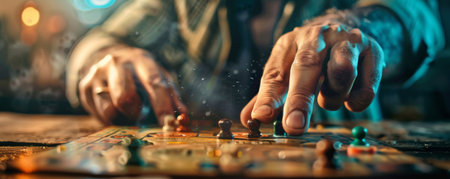 Closeup of black man playing board game with focus on male hand moving game piece, copy space