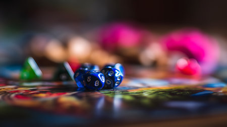 Blue dice displaying various numbers lie on a vibrant game board, suggesting an exciting tabletop adventure