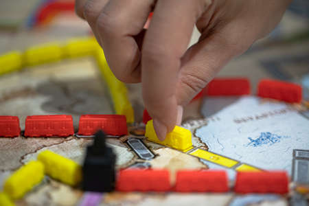 London, GB 11.02.2021 - Popular family railway-themed board game Ticket to Ride Europe map edition. Female player building routes connecting cities placing yellow train on board