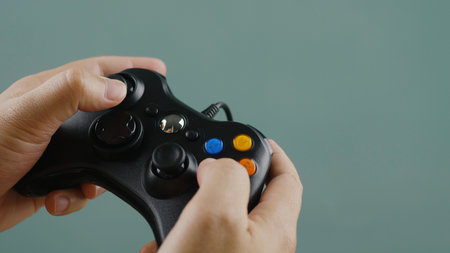 Playing games with joystick control and fun. Online gaming concept. Playing video games with joystick.