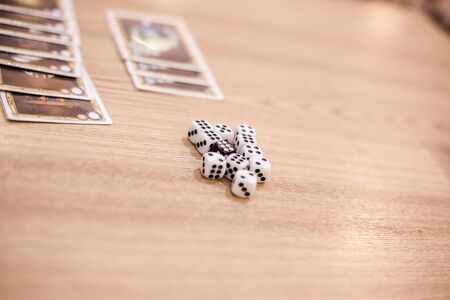 close up group of white dice show up the point on table while card game playing