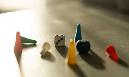 Yellow, green and red plastic dice and chips in children's board games. Selective focus