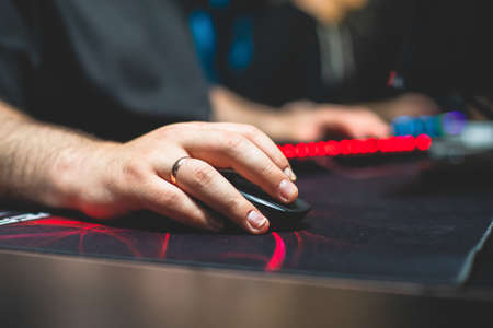 Cyber sport e-sports tournament, team of professional gamers, close-up on gamer's hands on a keyboard and mouse, gamers playing in competitive moba, fps game in a cyber games arena club