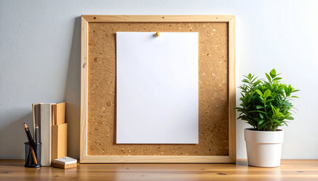 A corkboard with a blank sheet of paper is surrounded by books, pencils in a holder, and a small green plant on a wooden surface.