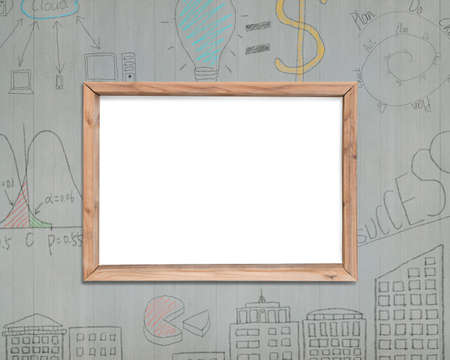 wooden frame with black field with marker and white pencil and eraser on black paper. Mockup. Real photo for you text