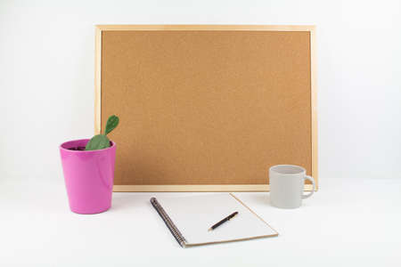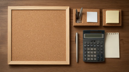 A minimalist workspace setup featuring a cork board, calculator, pens, and sticky notes, designed for productivity and efficient organization in any office or study environment.