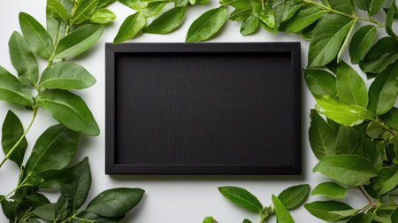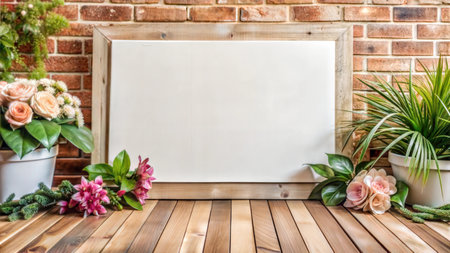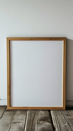 a blank white poster hangs on a wooden floor, surrounded by a wall picture frame. this minimalist composition, reminiscent of the american studio craft movement, showcases the influence of hard edge painters and abstract minimalism. the use of screen tones adds depth to the light gray backdrop. captured on fujifilm provia 400x film. ai generated